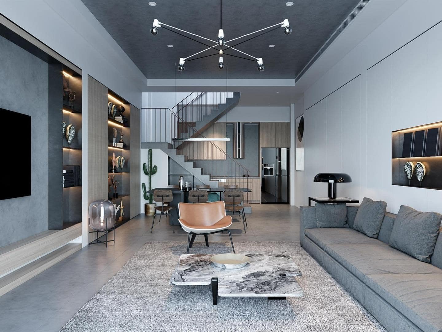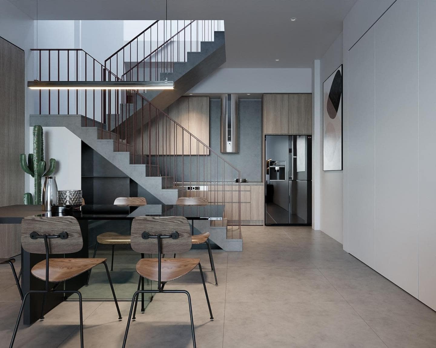 • Cầu thang thông tầng nằm giữa, giúp phân chia không gian hợp lý mà vẫn đảm bảo sự thông thoáng.